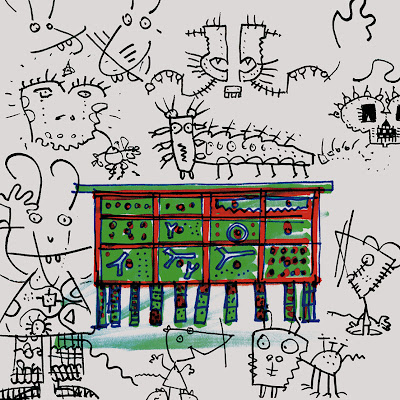 ... sollte ja eigentlich für die Ausstellung EIGENART, die letzte Woche in Dachsbach stattfand, komplett bemalt werden. Aber der Protest der Leute, die das fertige Möbelstück in unbemaltem Zustand sahen, war lautstark. "So etwas schönes darf man doch nicht übermalen!" "Fühlt doch die interessante Struktur der Schubladenoberflächen." "Wie habt Ihr die überhaupt so hingekriegt?" Also ließen wir es vorerst sein. Es hätte ja sein können, dass jemand während der Ausstellung gekommen wäre mit dem Satz: "Ja, wenn sie nicht angestrichen wäre, hätte ich sie gerne bei mir zu Hause."